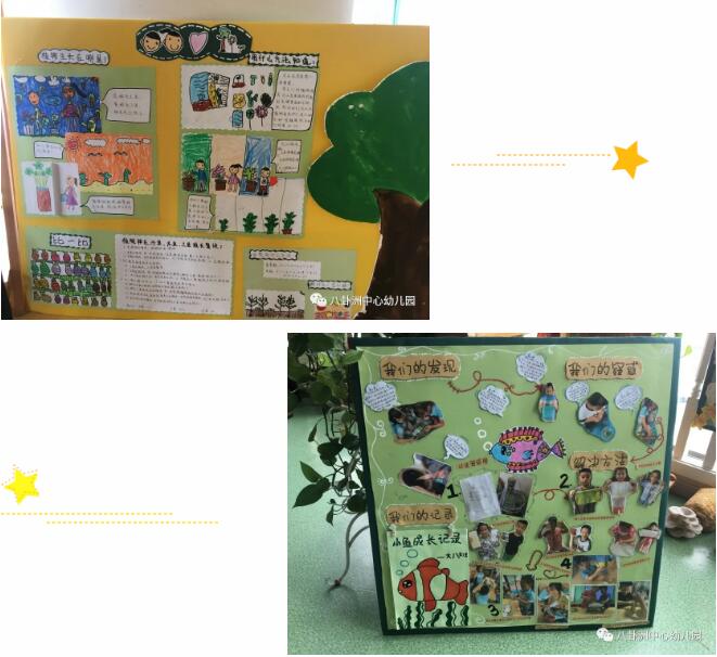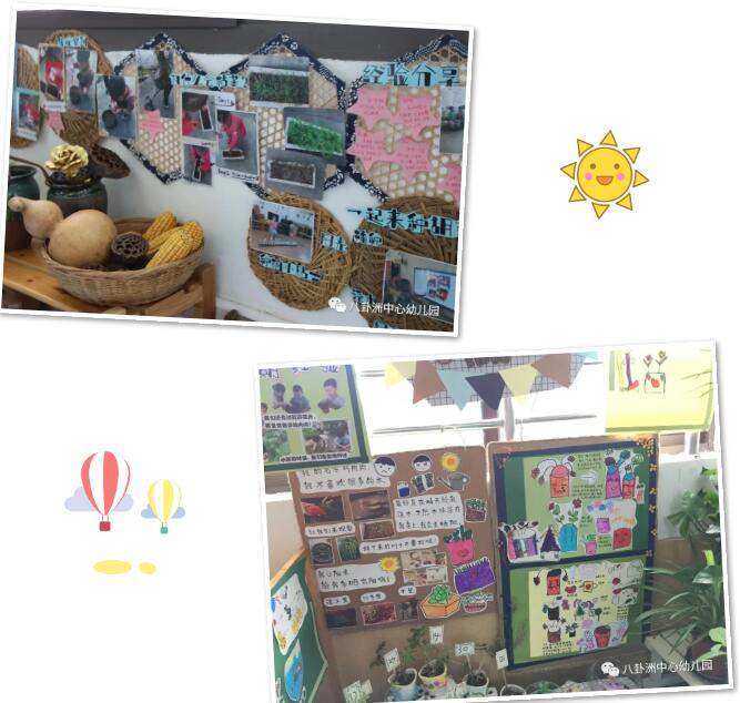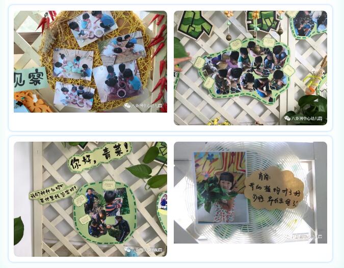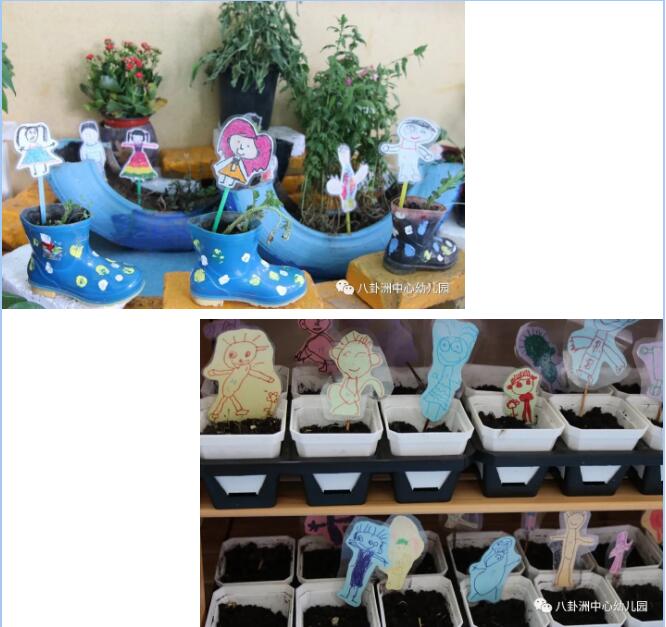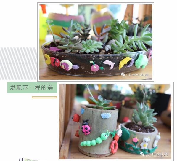大班自然角的种植区,幼儿自由地选择想要种植的植物,通过亲身体验、尝试,探究出植物的生长环境、秘密等。并将整个过程通过绘画、制作等形式表现出来,教师配上文字解说。各班从植物的摆放、花盆的装饰、彩泥的制作、自然物的艺术创造等各方面做出了自己班的特色,充分体现了幼儿的参与性和创造性。