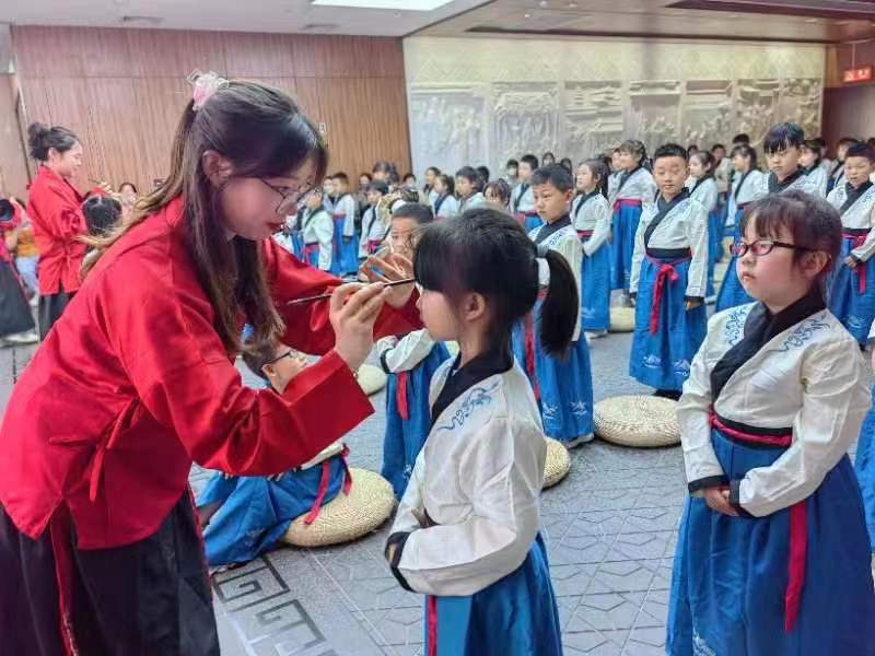 衣服的整洁体现人的精神状态,只有一个人衣装整洁才会显得有精神,有礼貌。“正衣冠”是让我们忆起先祖优秀品德的最好载体,也是让孩子们知书明理的第一步。“开笔”仪式在孩子们“正衣冠”之后正式开始!孩子们在主持人组织下,很快学会了整理汉服,和行“汉礼”。紧接着,园长妈妈给孩子们送上最美好的毕业祝愿。接下来,孩子在仪式主持人的组织下,经历了拜孔子、敬奉六礼、点朱砂、谢师恩、破笔开蒙、经典励志等仪式,在这些传统仪式中感受尊师孝敬、崇德立志的中华传统文化精髓,弘扬中华优良的传统文化。