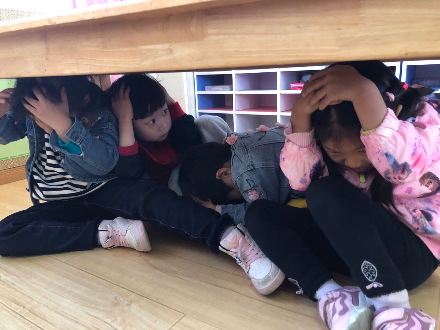 演练开始于早晨10点,随着警报声的响起,无论是室内还是室外的孩子都警觉起来,室内的孩子在老师的带领下按照总指挥的语音提示,在教室里做抱头动作找各种掩体进行躲避。
