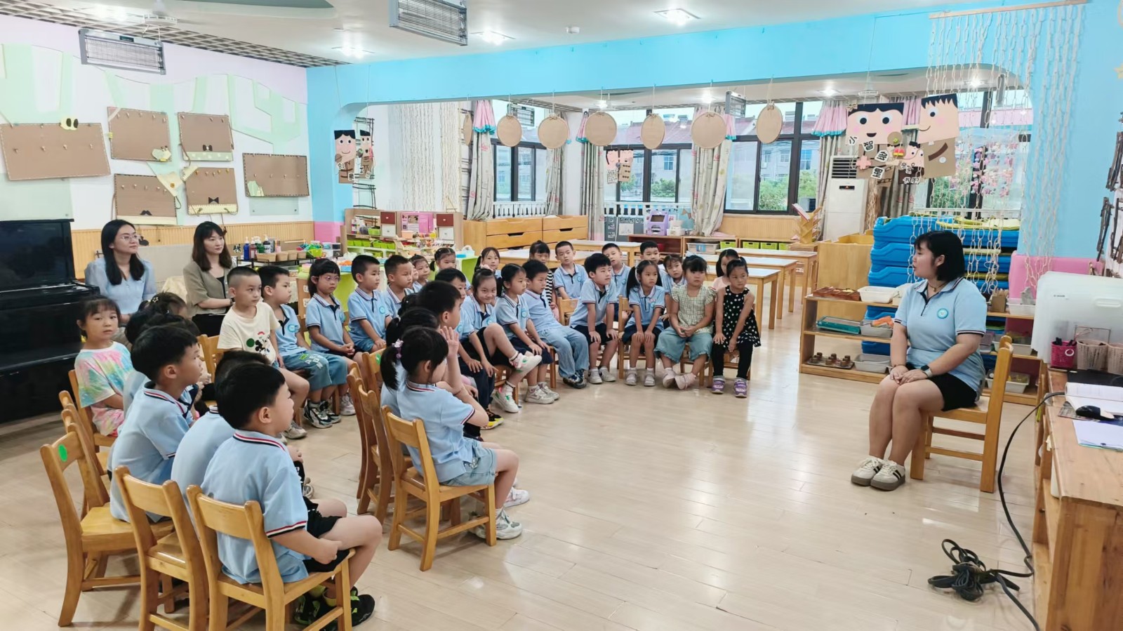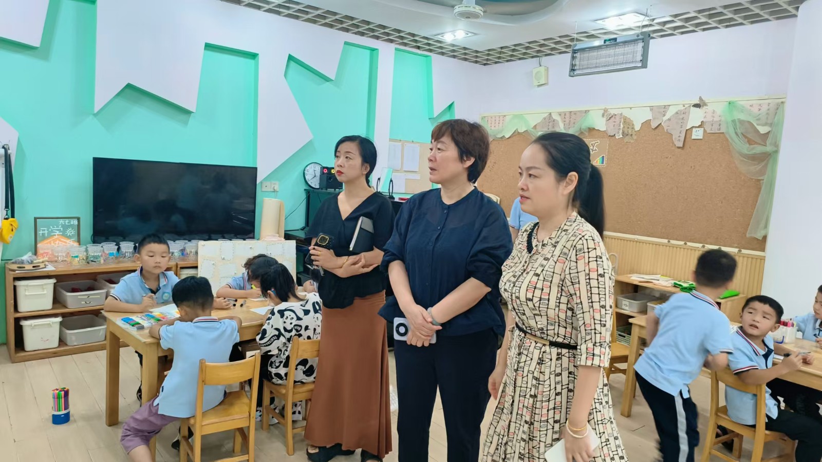 视导组专家们分组进入到各年龄段的活动现场,对幼儿的活动情况进行全面观察。在此过程中专家观摩了各年龄段孩子们的集体活动。在活动中,专家们不仅关注了教师的前期准备工作,还细致评估了幼儿经验积累的成效,就活动目标的实现程度以及师生互动的有效性进行了现场交流与反馈。在交流中,不仅给予了教师们宝贵的意见,还针对活动中的亮点给予了肯定。还特别赞赏了孩子们在活动中展现出的自由、自主、愉悦的精神状态,以及积极解决问题的良好学习品质。