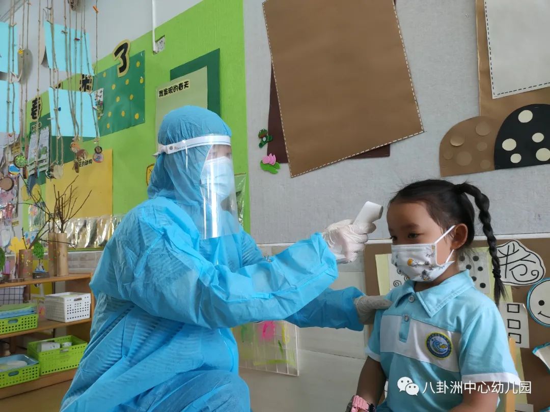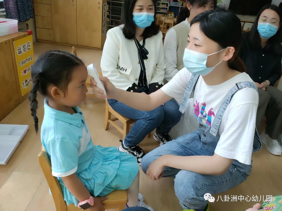 活动过程中,教师们通过模拟场景进行有序演练,模拟班级晨午检、教室通风、消毒,班主任对本班幼儿逐一测量体温及询问身体状况,并填写晨午检记录。模拟幼儿突发疫情应急处置,一名幼儿测量体温异常,班主任第一时间向保健教师报告。由保健教师穿防护服复测体温,班主任和配班老师维持班级秩序,复测若为正常,身体无不适继续在园学习,同一场所其他幼儿恢复正常学习秩序。体温复测若为异常,保健教师将其带至隔离区,班主任同步与幼儿家长取得联系,询问幼儿及同住人员近期活动轨迹和身体状况,并做好询问记录,请家长来园带孩子前往发热门诊就诊,保健教师登记上报。